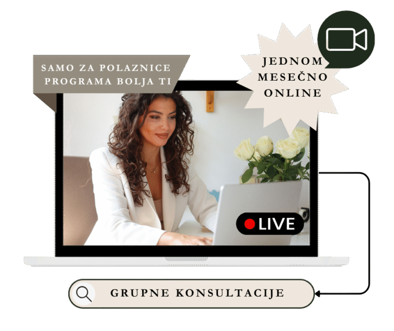 Jednom mesečno u tačno određenom terminu držim grupne konsultacije sa vašim unapred postavljenim pitanjima. Na online sastancima delimo uvide i diskutujemo o temama vezane za lični razvoj.
