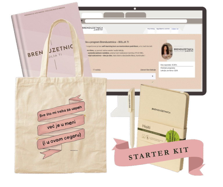 Prvog dana programa dobijaš pristup audio lekcijama na platformi, a na tvoju adresu stiže radna sveska, a uz to i poklon starter kit – Brenduzetnica ceger čiji je dizajn iznenađenje + notes + hemijska.