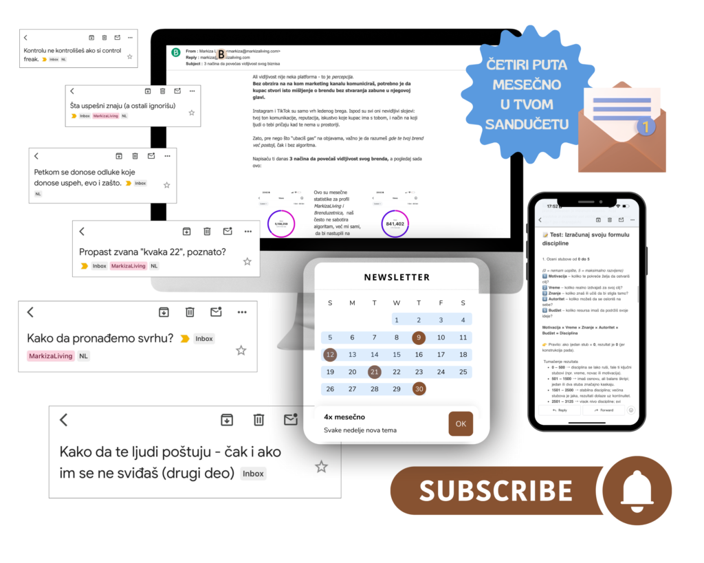 Kada se pretplatiš, prvi newsletter stiže tokom narednih dana, a zatim dobijaš mejlove četiri puta mesečno, jednom u toku radne nedelje, u različitim danima i terminima, bez fiksnog rasporeda, kako bi sadržaj ostao prirodan, relevantan i nenametljiv.