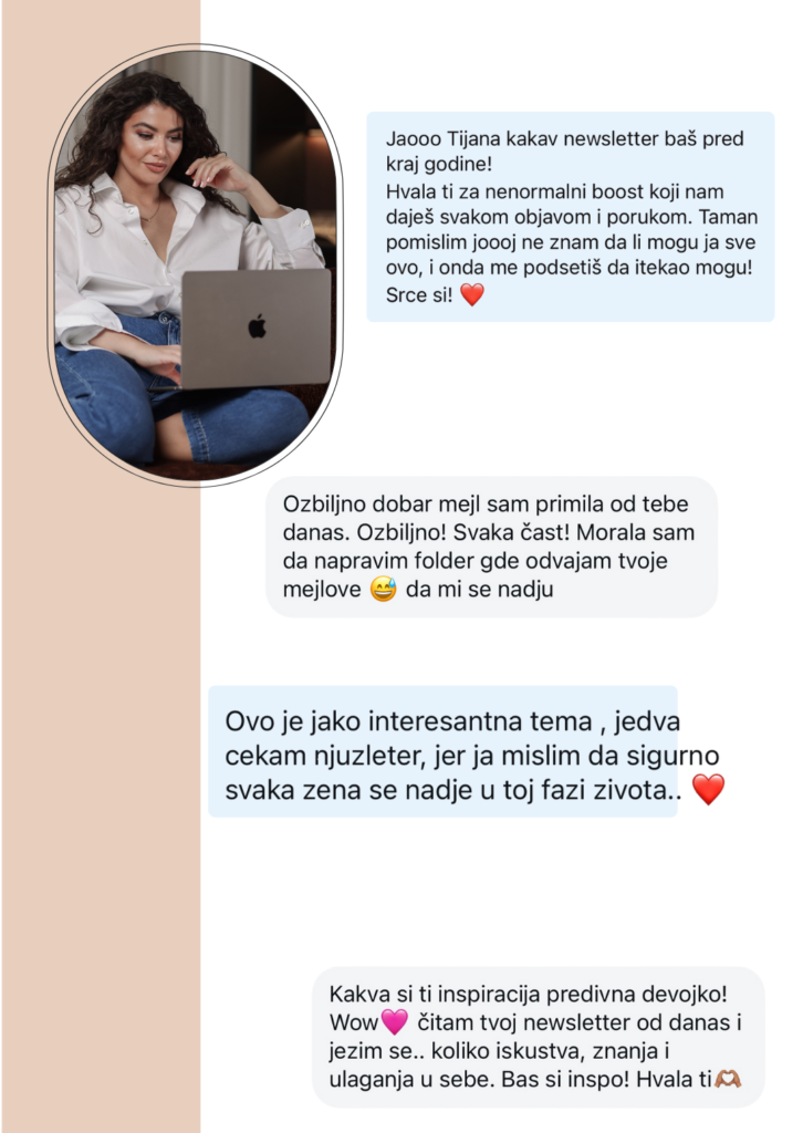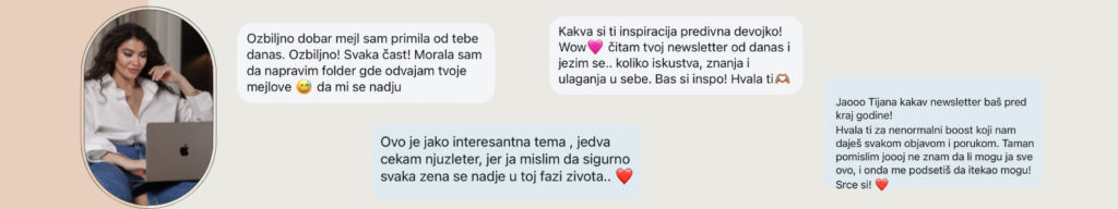 “Tvoji mailovi su mi postali deo rutine. Ne zato što su motivacioni, već zato što su smisleni. Često čujem u njima stvari koje nemam gde da čujem u svom okruženju – ni na poslu, ni među ljudima oko sebe. Pomogli su mi da drugačije gledam na sebe, na svoj rad i na odluke koje donosim. Nekad mi jedan tvoj mail razjasni ono o čemu razmišljam danima.”